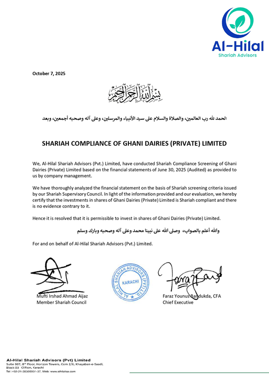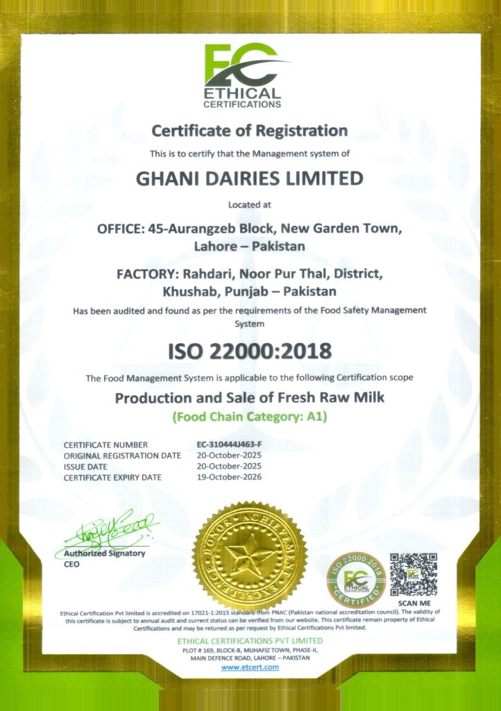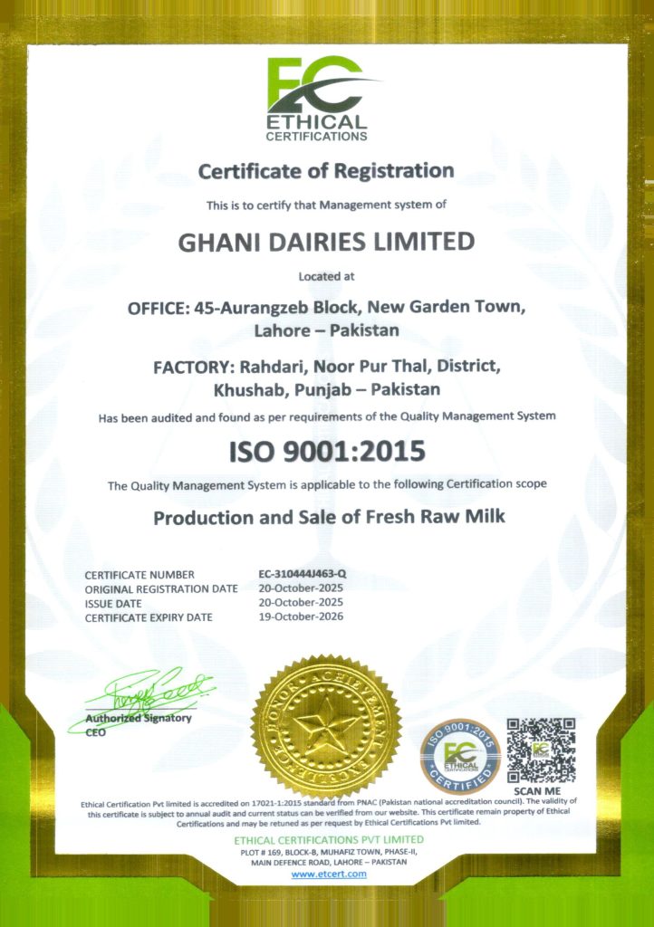 Ghani Dairies Limited a company of Ghani Group operates one of Pakistan’s most advanced corporate dairy farms. To support its operations, the Company has invested in modern infrastructure and equipment, including KUHN TMR feed mixing machines (France), automated milking parlors (United States), and a Plate Heat Exchanger (PHE) cooling system of European origin. A digital herd management system is also in place to monitor and optimize herd health and productivity.